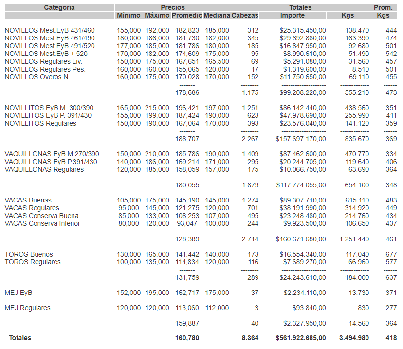 GanaderíaCierre mercado de hacienda el 17 de septiembre 17 de septiembre de 2021FacebookTwitterWhatsAppTelegramEmailImpresión PRECIOS DEFINITIVOS POR CATEGORIA PARA EL VIERNES 17/09/2021MERCADO DE LINIERSLee tambiénPronóstico para septiembre, octubre y noviembre 2021 MÁS INFO PARA TU CAMPO ENTRÁ AQUí