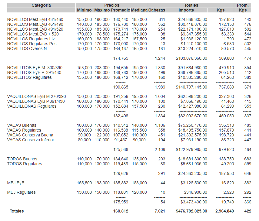 GanaderíaCierre mercado de hacienda el 7 de septiembre de 2021 7 de septiembre de 2021FacebookTwitterWhatsAppTelegramEmailImpresión PRECIOS DEFINITIVOS POR CATEGORIA PARAE EL MARTES 07/09/2021MERCADO DE LINIERSMÁS INFO PARA TU CAMPO ENTRÁ AQUí