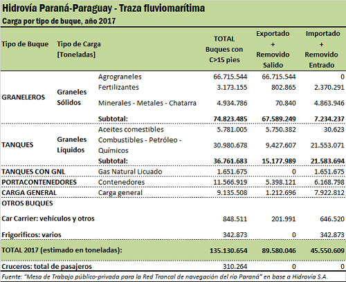 En un reciente trabajo realizado en la Provincia de Santa Fe por la denominada “Mesa de Trabajo público-privada para la Red Troncal de navegación del río Paraná” que integra la Bolsa de Comercio de Rosario y otras entidades privadas, se procedió a estimar el total de cargas en la Hidrovía Paraguay- Paraná, en el tramo fluviomarítimo (Santa Fe- Océano), para buques de calado superior a 15 pies de profundidad. Se utilizaron datos proporcionados por la empresa Hidrovía S.A. Como puede verse en el cuadro respectivo, las cargas totales ascenderían a 135 Mt. Se computan cargas graneleras sólidas y líquidas, cargas generales, portacontenedores, tanques con GNL, car carrier y cargas frigoríficas.