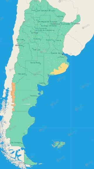 Buenos Aires: Pinamar – Sudeste de General Juan Madariaga – Villa Gesell – Ayacucho – Balcarce – General Guido – Maipú – Noroeste de General Juan Madariaga – Noroeste de Mar Chiquita – Oeste de General Pueyrredón – Costa de General Pueyrredón – Costa de Mar Chiquita – General Alvarado – Zona serrana de Benito Juárez – Zona serrana de Loberia – Zona serrana de Necochea – Zona serrana de – Costa de Lobería – Costa de Necochea – Costa de San Cayetano – Costa de Tres Arroyos – Adolfo Gonzales Chaves – Centro de Lobería – Norte de Coronel Dorrego – Norte de Necochea – Norte de San Cayetano – Norte de Tres Arroyos