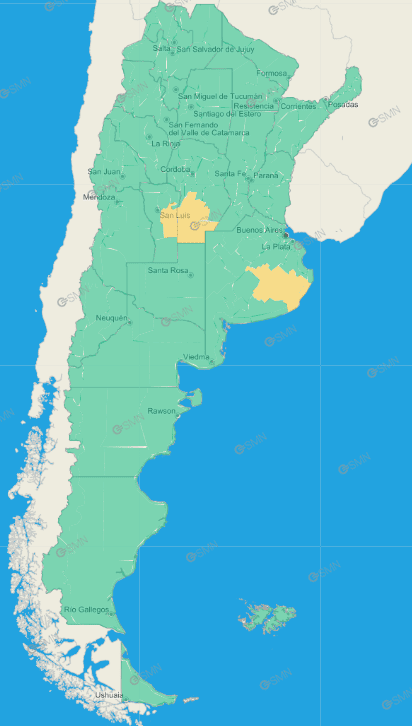 Buenos Aires: Pinamar – Sudeste de General Juan Madariaga – Villa Gesell – Costa de General Pueyrredón – Costa de Mar Chiquita – General Alvarado – Ayacucho – Balcarce – General Guido – Maipú – Noroeste de General Juan Madariaga – Noroeste de Mar Chiquita – Oeste de General Pueyrredón – Zona serrana de Benito Juárez – Zona serrana de Lobería – Zona serrana de Necochea – Zona serrana de Tandil – Azul – Rauch – Tapalqué – Zona baja de Benito Juárez – Zona baja de Tandil