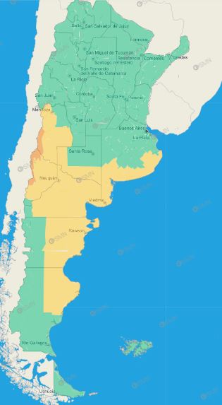Buenos Aires: Pinamar – Sudeste de General Juan Madariaga – Villa Gesell – Este de General Lavalle – La Costa – Ayacucho – Balcarce – General Guido – Maipú – Noroeste de General Juan Madariaga – Noroeste de Mar Chiquita – Oeste de General Pueyrredón – Costa de General Pueyrredón – Costa de Mar Chiquita – General Alvarado – Adolfo Gonzales Chaves – Centro de Lobería – Norte de Coronel Dorrego – Norte de Necochea – Norte de San Cayetano – Norte de Tres Arroyos – Norte de Bahía Blanca – Oeste de Patagones – Oeste de Villarino – Puan – Zona baja de Coronel Pringles – Zona baja de Coronel Suárez – Zona baja de Saavedra – Zona baja de Tornquist – Zona serrana de Coronel Pringles – Zona serrana de Coronel Suárez – Zona serrana de Saavedra – Zona serrana de Tornquist – Costa de Bahía Blanca – Costa de Coronel Dorrego – Costa de Coronel de Marina Leonardo Rosales – Costa de Villarino – Monte Hermoso – Costa de Patagones