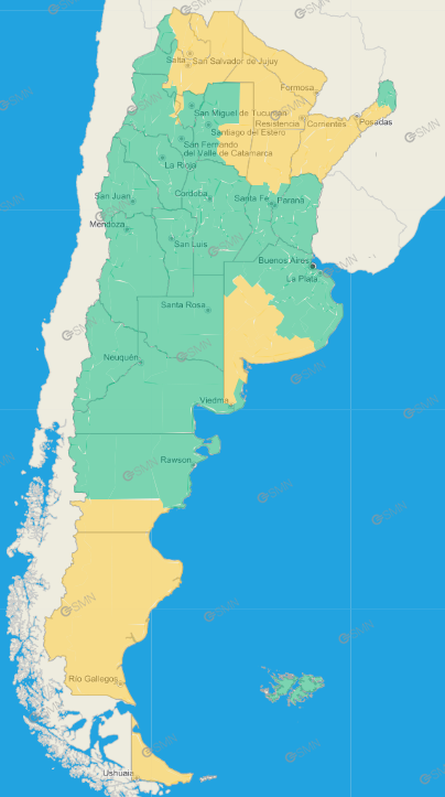 Buenos Aires: Norte de Bahía Blanca – Oeste de Patagones – Oeste de Villarino – Puan – Zona baja de Coronel Pringles – Zona baja de Coronel Suárez – Zona baja de Saavedra – Zona baja de Tornquist – Costa de Bahía Blanca – Costa de Coronel Dorrego – Costa de Coronel de Marina Leonardo Rosales – Costa de Villarino – Monte Hermoso – Costa de Lobería – Costa de Necochea – Costa de San Cayetano – Costa de Tres Arroyos – Adolfo Gonzales Chaves – Centro de Lobería – Norte de Coronel Dorrego – Norte de Necochea – Norte de San Cayetano – Norte de Tres Arroyos – Adolfo Alsina – Daireaux – Guaminí – Pellegrini – Salliqueló – Trenque Lauquen – Tres Lomas – General La Madrid – Laprida – Olavarría (entre 20 y 40 mm en Bs. As.)