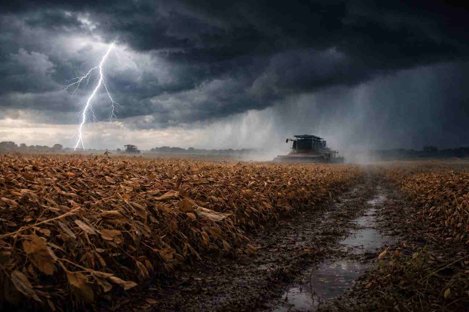 Tormenta con relámpago sobre campo de soja seca en estado R7, con cultivo inclinado por el viento y suelo embarrado, mientras una cosechadora trabaja con dificultad en la Pampa húmeda argentina.