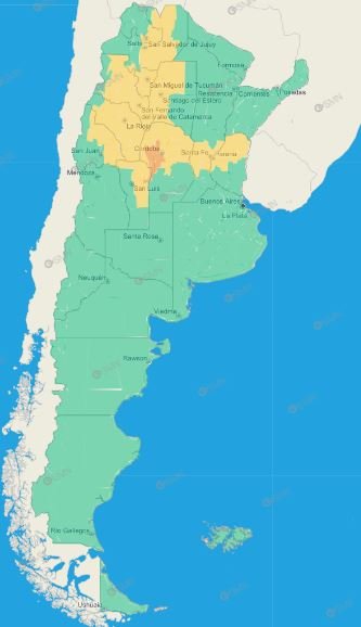 Tucumán: Burruyacú – Capital – Cruz Alta – Famaillá – Graneros – La Cocha – Leales – Simoca – Trancas – Yerba Buena – Zonas bajas de Chicligasta – Zonas bajas de Juan Bautista Alberdi – Zonas bajas de Lules – Zonas bajas de Monteros – Zonas bajas de Río Chico – Zonas bajas de Tafí Viejo – Zona montañosa de Andalgalá – Zona montañosa de Santa María – Zona montañosa de Chicligasta – Zona montañosa de Juan Bautista Alberdi – Zona montañosa de Lules – Zona montañosa de Monteros – Zona montañosa de Río Chico – Zona montañosa de Tafí Viejo – Zona montañosa de Tafí del Valle