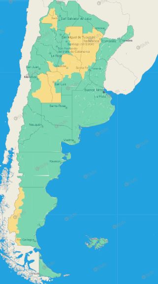 Córdoba: San Justo – Río Primero – Río Segundo – Tercero Arriba – Ischilín – Río Seco – Sobremonte – Tulumba – Punilla – Zona serrana de Colón – Zona serrana de Ischilín – Zona serrana de Santa María – Zona serrana de Totoral – Zona baja de Calamuchita – Zona baja de Santa María – Zona serrana de Calamuchita – Zona serrana de Río Cuarto – Oeste de Pocho – Oeste de San Alberto – Oeste de San Javier