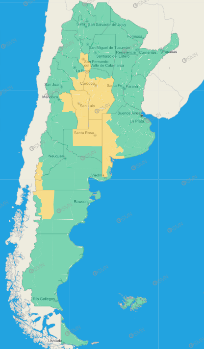 Buenos Aires: Costa de Patagones – Norte de Bahía Blanca – Oeste de Patagones – Oeste de Villarino – Puan – Zona baja de Coronel Pringles – Zona baja de Coronel Suárez – Zona baja de Saavedra – Zona baja de Tornquist – Costa de Bahía Blanca – Costa de Coronel Dorrego – Costa de Coronel de Marina Leonardo Rosales – Costa de Villarino – Monte Hermoso – Adolfo Alsina – Daireaux – Guaminí – Pellegrini – Salliqueló – Trenque Lauquen – Tres Lomas – Florentino Ameghino – General Villegas – Rivadavia