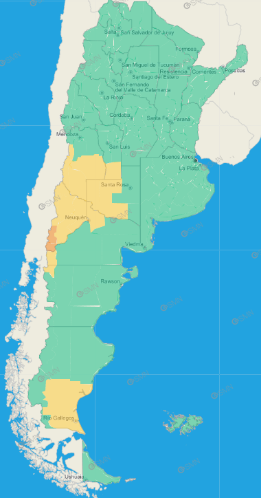 Santa Cruz: Meseta de Corpen Aike – Meseta de Güer Aike – Meseta de Lago Argentino – Costa de Corpen Aike – Costa de Güer Aike (El área será afectada por vientos del sector oeste con velocidades entre 50 y 70 km/h, con ráfagas que pueden alcanzar los 100 km/h.)