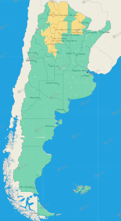 Tucumán: Burruyacú – Capital – Cruz Alta – Famaillá – Graneros – La Cocha – Leales – Simoca – Trancas – Yerba Buena – Zonas bajas de Chicligasta – Zonas bajas de Juan Bautista Alberdi – Zonas bajas de Lules – Zonas bajas de Monteros – Zonas bajas de Río Chico – Zonas bajas de Tafí Viejo – Zona montañosa de Andalgalá – Zona montañosa de Santa María – Zona montañosa de Chicligasta – Zona montañosa de Juan Bautista Alberdi – Zona montañosa de Lules – Zona montañosa de Monteros – Zona montañosa de Río Chico – Zona montañosa de Tafí Viejo – Zona montañosa de Tafí del Valle – Valles de Santa María – Valles de Tafí del Valle