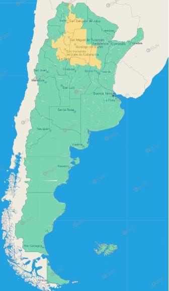 Tucumán: Burruyacú – Capital – Cruz Alta – Famaillá – Graneros – La Cocha – Leales – Simoca – Trancas – Yerba Buena – Zonas bajas de Chicligasta – Zonas bajas de Juan Bautista Alberdi – Zonas bajas de Lules – Zonas bajas de Monteros – Zonas bajas de Río Chico – Zonas bajas de Tafí Viejo – Zona montañosa de Andalgalá – Zona montañosa de Santa María – Zona montañosa de Chicligasta – Zona montañosa de Juan Bautista Alberdi – Zona montañosa de Lules – Zona montañosa de Monteros – Zona montañosa de Río Chico – Zona montañosa de Tafí Viejo – Zona montañosa de Tafí del Valle