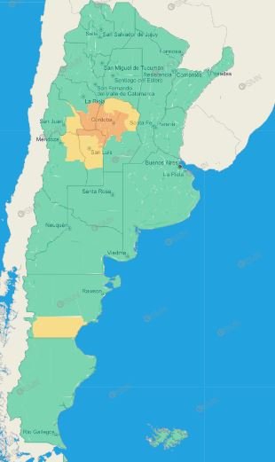 Córdoba: Zona baja de Calamuchita – Zona baja de Santa María – Zona serrana de Calamuchita – Zona serrana de Río Cuarto – Río Primero – Río Segundo – Tercero Arriba Punilla – Zona serrana de Colón – Zona serrana de Ischilín – Zona serrana de Santa María – Zona serrana de Totoral – Zona serrana de Cruz del Eje – Zona serrana de Minas – Zona serrana de Pocho – Zona serrana de San Alberto – Zona serrana de San Javier – Oeste de Pocho – Oeste de San Alberto – Oeste de San Javier – Zona baja de Cruz del Eje – Zona baja de Minas