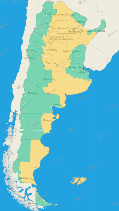 Buenos Aires: Este de General Lavalle – La Costa – Pinamar – Sudeste de General Juan Madariaga – Villa Gesell – Costa de General Pueyrredón – Costa de Mar Chiquita – General Alvarado – Ayacucho – Balcarce – General Guido – Maipú – Noroeste de General Juan Madariaga – Noroeste de Mar Chiquita – Oeste de General Pueyrredón – Costa de Lobería – Costa de Necochea – Costa de San Cayetano – Costa de Tres Arroyos – Adolfo Gonzales Chaves – Centro de Lobería – Norte de Coronel Dorrego – Norte de Necochea – Norte de San Cayetano – Norte de Tres Arroyos – Norte de Bahía Blanca – Oeste de Patagones – Oeste de Villarino – Puan – Zona baja de Coronel Pringles – Zona baja de Coronel Suárez – Zona baja de Saavedra – Zona baja de Tornquist – General La Madrid – Laprida – Olavarría – Adolfo Alsina – Daireaux – Guaminí – Pellegrini – Salliqueló – Trenque Lauquen – Tres Lomas – Costa de Patagones – Florentino Ameghino – General Villegas – Rivadavia – Bolívar – Carlos Casares – Carlos Tejedor – Hipólito Yrigoyen – Pehuajó – Costa de Adolfo Alsina