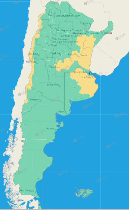 Buenos Aires: Berisso – Ensenada – La Plata – Este de Castelli – Este de Chascomús – Este de Dolores – Este de Lezama – Este de Magdalena – Este de Punta Indio – Este de Tordillo -Brandsen – Cañuelas – Oeste de Magdalena – San Vicente – General Las Heras – General Rodríguez – Luján – Marcos Paz – Mercedes – San Andrés de Giles – Suipacha – Arrecifes – Capitán Sarmiento – Carmen de Areco – Chacabuco – Colón – General Arenales – General Pinto – Junín – Leandro N. Alem – Lincoln – Pergamino – Rojas – Salto – Alberti – Bragado – Chivilcoy – General Viamonte – Nueve de Julio – Veinticinco de Mayo – General Alvear – General Belgrano – General Paz – Las Flores – Lobos – Monte – Navarro – Roque Pérez – Saladillo – Costa de General Pueyrredón – Costa de Mar Chiquita – General Alvarado – Pinamar – Sudeste de General Juan Madariaga – Villa Gesell – Este de General Lavalle – La Costa – Oeste de Castelli – Oeste de Chascomús – Oeste de Dolores – Oeste de General Lavalle – Oeste de Lezama – Oeste de Punta Indio – Oeste de Tordillo – Pila