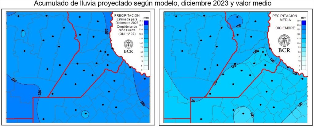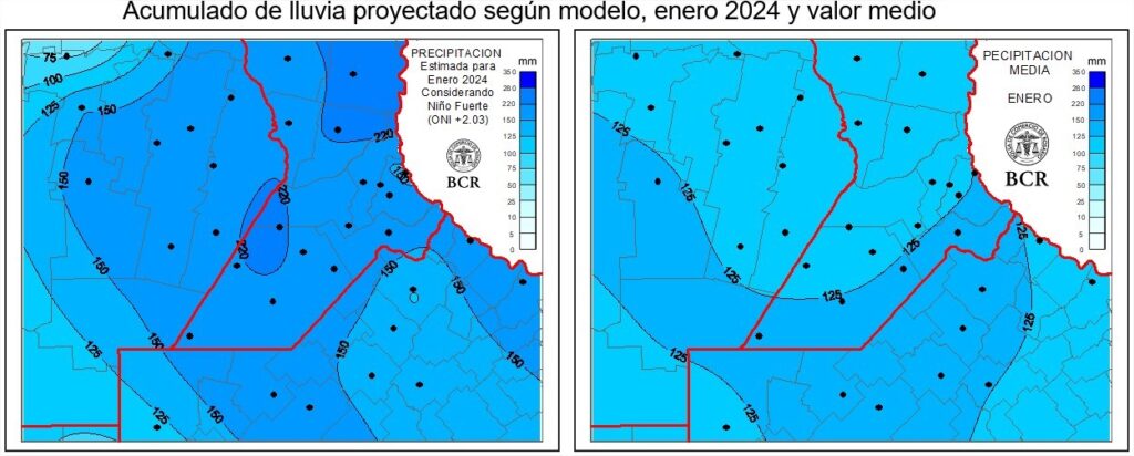 Por primera vez para la región núcleo, con información de la red de estaciones de la Bolsa de Comercio de Rosario (BCR), se desarrolló un algoritmo para calcular las proyecciones mensuales de lluvias de octubre a enero del 2024