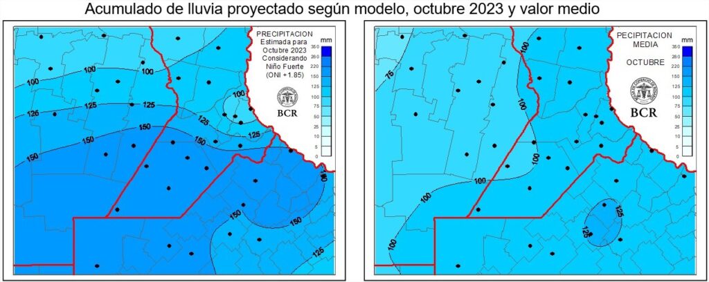 Por primera vez para la región núcleo, con información de la red de estaciones de la Bolsa de Comercio de Rosario (BCR), se desarrolló un algoritmo para calcular las proyecciones mensuales de lluvias de octubre a enero del 2024. La información es por demás de relevante considerando que luego de tres Niñas consecutivas, se espera para los próximos meses un Niño, que según las últimas estimaciones será más moderado de lo esperado, bajando el riesgo de excesos hídricos previsto inicialmente.