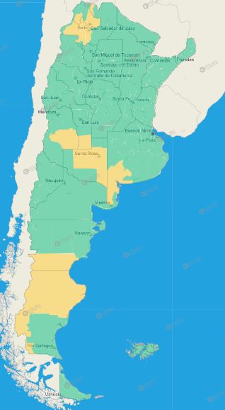 Buenos Aires: (entre 30 y 50 mm) Norte de Bahía Blanca – Oeste de Patagones – Oeste de Villarino – Puan – Zona baja de Coronel Pringles – Zona baja de Coronel Suárez – Zona baja de Saavedra – Zona baja de Tornquist – Costa de Bahía Blanca – Costa de Coronel Dorrego – Costa de Coronel de Marina Leonardo Rosales – Costa de Villarino – Monte Hermoso