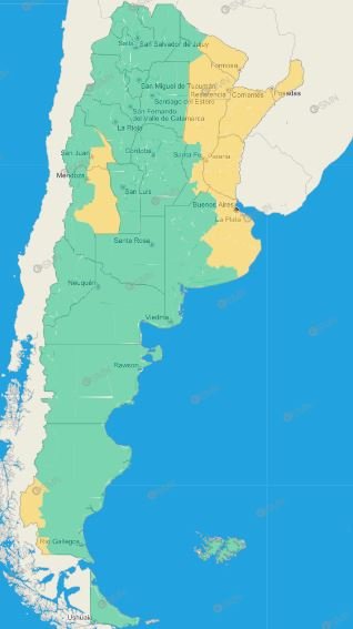 Buenos Aires: Almirante Brown – Avellaneda – Berazategui – Florencio Varela – Lanús – Lomas de Zamora – Presidente Perón – Quilmes – Berisso – Ensenada – La Plata – Esteban Echeverría – Ezeiza – La Matanza – Merlo – General San Martín – Hurlingham – Ituzaingó – Jose C. Paz – Malvinas Argentinas – Moreno – Morón – Pilar – San Miguel – Tres de Febrero – Escobar – San Fernando – San Isidro – Tigre – Vicente López – Campana – Exaltación de la Cruz – San Antonio de Areco – Zárate – Baradero – Ramallo – San Nicolás – San Pedro – General Las Heras – General Rodríguez – Luján – Marcos Paz – Mercedes – San Andrés de Giles – Suipacha – General Alvear – General Belgrano – General Paz – Las Flores – Lobos – Monte – Navarro – Roque Pérez – Saladillo – Azul – Rauch – Tapalqué – Zona baja de Benito Juárez – Zona baja de Tandil – Oeste de Castelli – Oeste de Chascomús – Oeste de Dolores – Oeste de General Lavalle – Oeste de Lezama – Oeste de Punta Indio – Oeste de Tordillo – Pila – Este de Castelli – Este de Chascomús – Este de Dolores – Este de Lezama – Este de Magdalena – Este de Punta Indio – Este de Tordillo – Ayacucho – Balcarce – General Guido – Maipú – Noroeste de General Juan Madariaga – Noroeste de Mar Chiquita – Oeste de General Pueyrredón – Costa de Lobería – Costa de Necochea – Costa de San Cayetano – Costa de Tres Arroyos – Costa de General Pueyrredón – Costa de Mar Chiquita – General Alvarado – Pinamar – Sudeste de General Juan Madariaga – Villa Gesell – Este de General Lavalle – La Costa