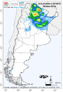 Al día de la fecha, el pronóstico indica lluvias y tormentas de variada intensidad sobre la reg. Pampeana, Cuyo, NEA y NOA (sur).