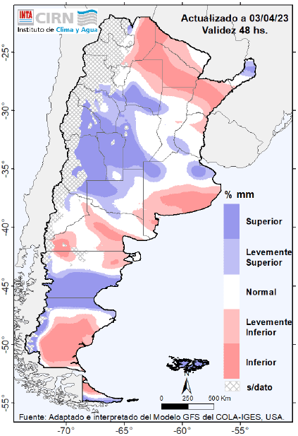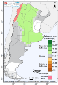 Las precipitaciones pronosticadas resultarían superiores a las normales para la época sobre el NOA (este) NEA (norte) La Pampa, Chubut (oeste) Santa Cruz (oeste) y Tierra del Fuego.