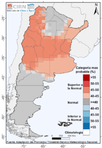 En cuanto a las temperaturas medias del trimestre se prevén, con mayor probabilidad de ocurrencia, valores entre normales a más cálidos que los promedios históricos sobre el centro, noroeste y noreste del país Mientras que sobre el resto del territorio son mayores las probabilidades de un trimestre con temperaturas medias normales.