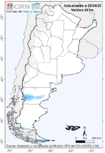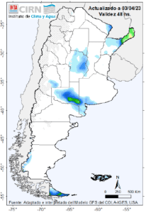 Se podrían registrar algunas lluvias y tormentas aisladas con mejoramientos temporarios sobre Mendoza, La Pampa, Bs. As. (sudoeste) Córdoba y las provincias del NEA. Algunas tormentas podrían ser intensas sobre Formosa y Misiones.