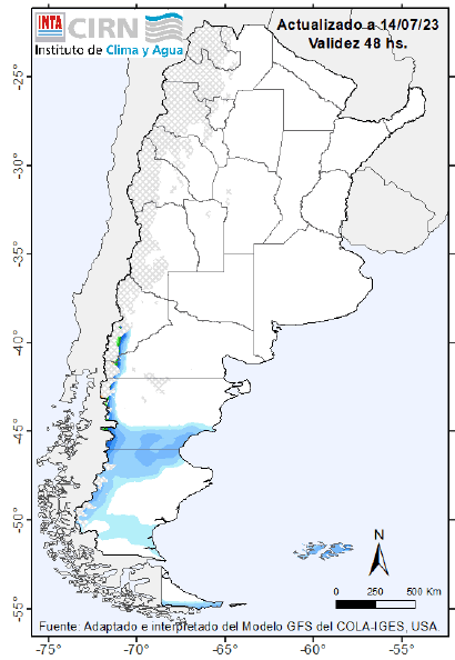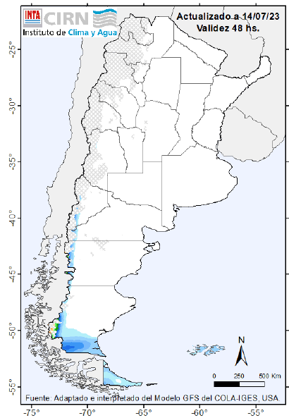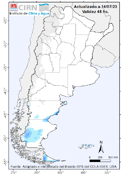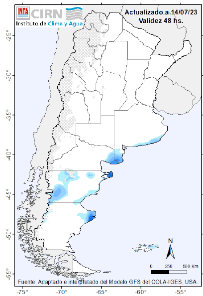 Nevadas de variada intensidad sobre Patagonia (centro y sur) Algunos chaparrones sobre Bs. As. (sur). Sin precipitaciones significativas sobre la mayor parte del centro y norte del país.