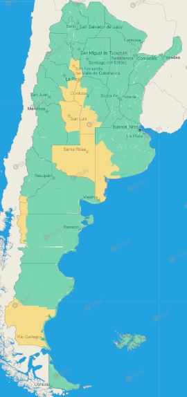 Buenos Aires: Costa de Patagones – Norte de Bahía Blanca – Oeste de Patagones – Oeste de Villarino – Puan – Zona baja de Coronel Pringles – Zona baja de Coronel Suárez – Zona baja de Saavedra – Zona baja de Tornquist – Costa de Bahía Blanca – Costa de Coronel Dorrego – Costa de Coronel de Marina Leonardo Rosales – Costa de Villarino – Monte Hermoso – Adolfo Alsina – Daireaux – Guaminí – Pellegrini – Salliqueló – Trenque Lauquen – Tres Lomas