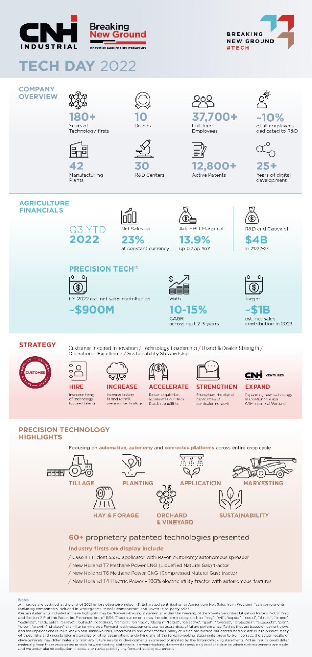 “Nuestro Tech Day mostrará al mundo cómo CNH Industrial aprovecha su gran fuerza para desarrollar e implementar una tecnología que simplifica y mejora las operaciones, proporciona datos reveladores y utiliza soluciones de energía alternativa, todo ello para hacer avanzar la agricultura de forma sostenible”, afirma Scott W. Wine, Chief Executive Officer, CNH Industrial. “También se exhibirán los grandes aportes de Raven a dicho esfuerzo, para demostrar que hemos incorporado sus capacidades y hemos agilizado nuestra oferta tecnológica con el fin de crear soluciones para los clientes que fomenten la eficiencia y la rentabilidad”.