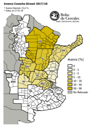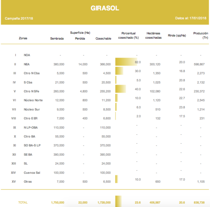 Por último, el resto del área girasolera implantada en Buenos Aires y La Pampa se encuentra diferenciando etapas desde botón floral hasta comienzos de llenado de grano, bajo una condición de humedad que varía entre regular y adecuada. En lotes afectados por la falta de humedad en el sudoeste de Buenos Aires se relevaron cuadros desparejos con plantas de menor porte. La presión sanitaria es normal con presencia de chinche diminuta y roya blanca en el centro-oeste bonaerense.