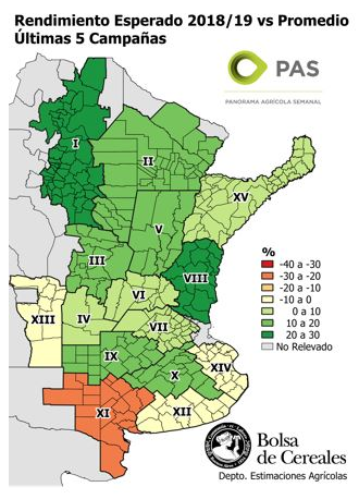 Se prevé que los promedios zonales al cierre del ciclo se ubiquen por sobre la media de las últimas cinco campañas en varias regiones del centro y norte del área agrícola, no así en el extremo sur en donde las productividades se encuentran afectadas por déficit hídrico y heladas tempranas.
