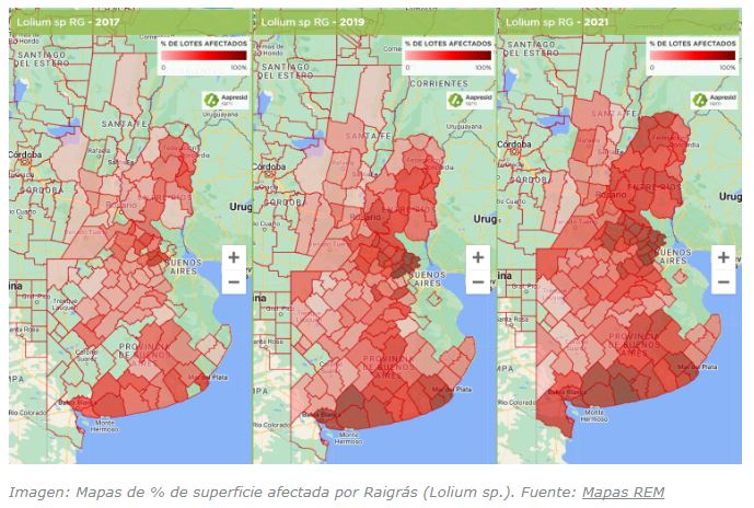 Según el último mapeo realizado por la REM en el 2021, la superficie afectada por Lolium sp. resistente a glifosato se incrementó desde el año 2017, y su distribución se expandió a casi la totalidad de la provincia de Buenos Aires, Entre Ríos, centro-sur de Santa Fe y algunos departamentos de Córdoba.