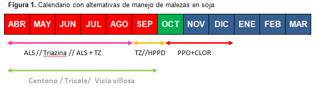 “Desde Marcos Juárez creemos que es importante incluir una etapa de barbecho intermedio, con herbicidas que controlen Yuyo colorado, porque éste comienza a emerger a fin de agosto, principios de septiembre, cuando también empiezan a emerger gramíneas”, remarcó. “Es clave controlar las primeras camadas de colorados y así ayudar a controlar la gramínea. Lo mismo para la etapa de barbecho corto, que son los que usamos para que acompañen el cultivo, incluso hasta diciembre. La idea es lograr un control de malezas de tal forma que el cultivo cierre el surco libre de la competencia de malezas resistentes”, explicó. De esta manera se aplican diferentes modos de acción para no presionar la generación de resistencia (Figura 1).