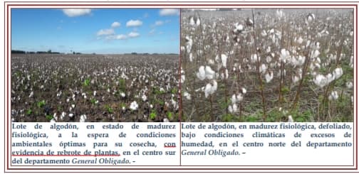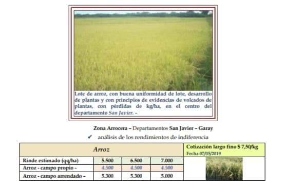 Los rendimientos registrados en la zona fueron de 17 – 18 qq/ha en los mínimos y los máximos de 34 – 36 qq/ha. Se recuerda que la fecha límite de destrucción de los rastrojos del cultivo, sería el 31 de mayo para la zona este y el 15 de junio para la zona oeste. En el área algodonera oeste, ante las condiciones climáticas desfavorables, la imposibilidad de la realización de actividades específicas y con nuevas precipitaciones, la realidad muy compleja de por sí, sin actividades, pasó a pérdidas e inactividad que con el transcurso de los días se iría evaluando y cuantificando las consecuencias e impactos. Lote de arroz, con buena uniformidad de lote, desarrollo de plantas y con principios de evidencias de volcados de plantas, con pérdidas de kg/ha, en el centro del departamento San Javier. –