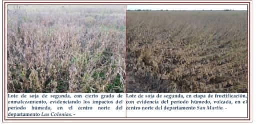 Los altos porcentajes de humedad ambiente, el aumento de áreas encharcadas y otras anegadas, producción hongos, podredumbre de tallos, vuelco de plantas, áreas con un progresivo aumento de malezas, características e indicadores que fueron mostrando los cultivares de soja tardía, en este último período, reflejando lo perjudicial y el marcado impacto del clima sobre la campaña 2018/2019. El grado de avance de la cosecha fue del orden del 25 %, representando aproximadamente unas 125.625 ha, con un adelanto de 10 puntos, en comparación a la campaña pasada, para el mismo período. El mayor avance logrado en la recolección fue en los departamentos del sur (San Martín, San Jerónimo) y del centro (Castellanos, Las Colonias y La Capital). Los rendimientos mínimos fluctuaron entre 18 – 20 – 22 qq/ha, los máximos entre 38 – 40 – 42 qq/ha y en lotes puntuales de 45 qq/ha. El cultivo se encontró en un 60 % estado bueno, con sectores o áreas muy buenas y lotes puntuales a excelentes, un 20 % en estado regular y el resto un 20 % en estado regular a malo, con impactos y consecuencias directas por los eventos climáticos sufridos. Se observaron los siguientes estados fenológicos: R “estados reproductivos” en un bajo porcentaje en R2 (floración con uno de los nudos superiores con hojas desarrolladas), R3 (vaina de 5 mm de longitud en nudo), R4 (vaina de 20 mm de longitud en nudo), R5 (comienzo de llenado de semilla en nudo, semilla de 3 mm de longitud), R6 1 (semilla verde de tamaño máximo del nudo), R7 (comienzo de madurez, una vaina con color de madurez) y lotes más avanzados en R8 (madurez plena).