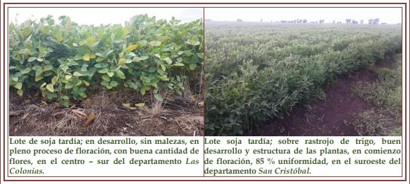 Lo enunciado en el informe anterior: se “evidenció alguna reacción positiva, en especial en la estructura de las plantas”, como consecuencia de los escenarios climáticos registrados, con precipitaciones y recarga de los perfiles de suelos, brindando buena disponibilidad de agua útil, se concretó y observó un 68 % del total de soja tardía en estado bueno a muy bueno, con algunos lotes excelentes, un 20 % regular y un 12 % malo.