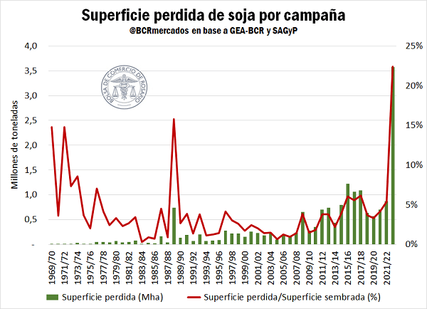 Pero la campaña que acaba de comenzar deja otros varios hitos negativos desde el punto de vista productivo. Según informa GEA, la superficie perdida (es decir, el área que directamente no será cosechada) alcanza la friolera suma de 3,58 Mha. Esto marca un máximo histórico para el país y prácticamente triplica el máximo anterior de la 2015/16 (1,22 Mha). Incluso, hay que remarcar que, en aquel entonces, la superficie sembrada a nivel nacional superaba las 20 Mha, mientras que en este último ciclo el área implantada alcanzó cerca de 16 Mha, por lo que la superficie perdida sobre el total implantado en este último ciclo es mucho mayor: 22% vs. 6% en aquel entonces. Tomando este indicador, es decir superficie perdida sobre superficie sembrada, la 2022/23 también marca un máximo histórico, quedando por encima del 16% de la 1988/89.