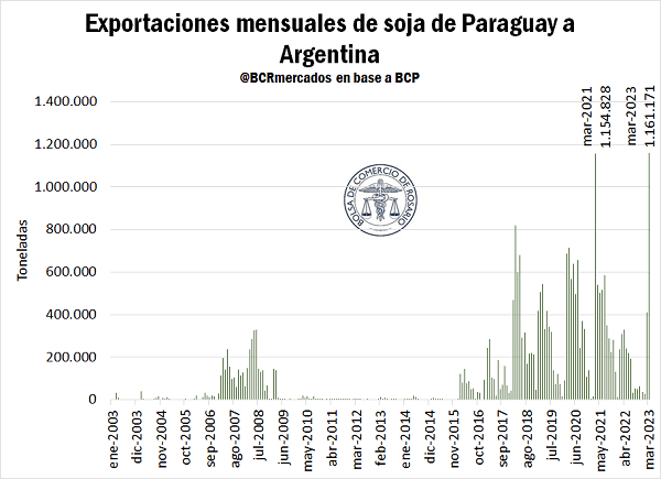 Al respecto de la importación temporaria, si bien aún no hay datos del mes de marzo sobre importaciones del INDEC, el Banco Central del Paraguay ya tiene publicados los datos de exportaciones de aquel país para el mes pasado, e informa que un total de 1,16 Mt de soja con destino Argentina fueron despachadas, marcando un máximo histórico para un solo mes, por encima del 1,15 Mt que se exportaron en marzo de 2021.
