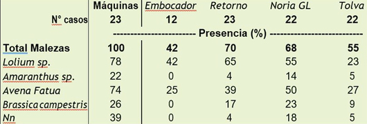 En el cuadro se presenta un resumen de lo observado. El 100% de las cosechadoras tuvo presencia de semillas de malezas; sin embargo, su densidad fue muy variable entre máquinas y entre sitios de la máquina. Por ejemplo, semillas de raigrás y avena negra estuvieron presentes en el 78% y 74% de los casos evaluados, respectivamente. En tanto, semillas de nabo y Amaranthus palmeri mostraron una presencia menor y aparecieron, además, varias especies con escasa representación (Gramíneas, Cyperaceas, Violáceas, entre otras)
