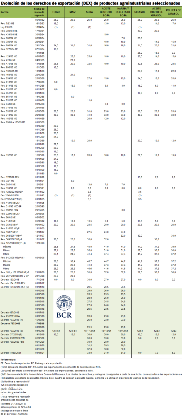 Cuadro actualizado con la evolución de las alícuotas aplicables a la exportación de productos agroindustriales seleccionados, entre los que se encuentran los principales granos y subproductos que produce y embarca Argentina.