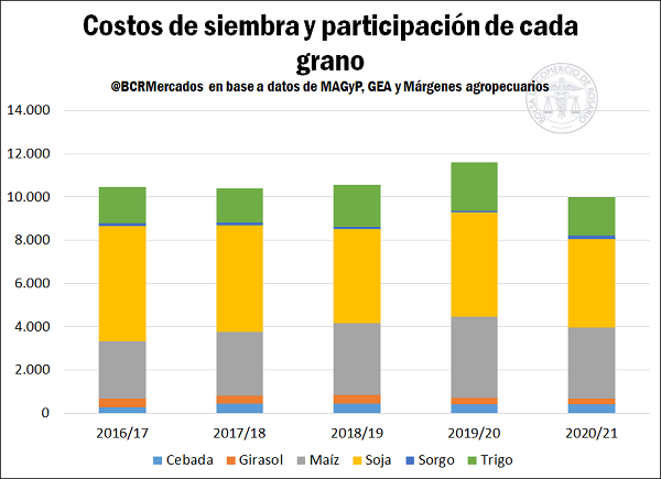 Los principales beneficios de costos se dieron para la siembra de trigo y para la soja de primera, con valores en dólares que cayeron un 16,2% y un 14%, respectivamente. Además, los únicos aumentos fueron para la cebada cervecera, forrajera y el girasol de Buenos Aires y La Pampa. En otras palabras, los granos que tuvieron caídas en sus costos representan 93% del territorio total sembrado, mientras que el 7% restante exhibió incrementos.