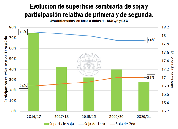 En otro orden de factores que influyeron sobre la inversión nacional necesaria para la siembra se encuentran las variaciones en las hectáreas sembradas de cada cultivo. El desenvolvimiento de los últimos años muestra importantes modificaciones en las decisiones productivas. Uno de los principales puntos a destacar es la caída en la superficie sembrada de soja, pasando de 20,5 M ha en la campaña 2015/16 a 16,9 M ha en la campaña 2020/21. Incluso, dentro de esta caída, se da una variación muy importante en la participación relativa de la soja de primera y de segunda. En efecto, la soja de segunda ganó un terreno muy significativo de la mano del crecimiento en las siembras de cereales de invierno, aumentando la superficie casi un 40% desde el inicio del período considerado. Lo que antes era un 80% de soja de primera y un 20% de soja de segunda, hoy se encuentra próximo a un 70% y 30% respectivamente. Esta modificación impacta considerablemente en el global de los costos, puesto que la inversión por hectárea de la soja de segunda es un 24% menor que la soja de primera.