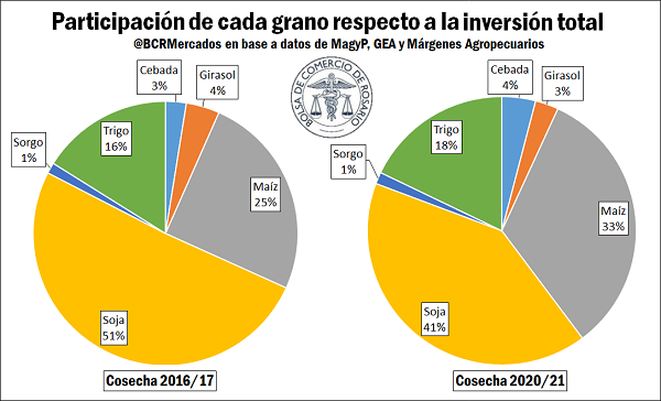 Otras variaciones de superficies que influyeron sobre la inversión nacional, fueron los aumentos en el área sembrada de maíz y de trigo. En este sentido, el aumento de superficie de casi el 40% para el primero y del 60% para el segundo implican incrementos relativos en los costos de siembra, puesto que ambos cultivos poseen requerimientos de inversión superiores a los de la soja.