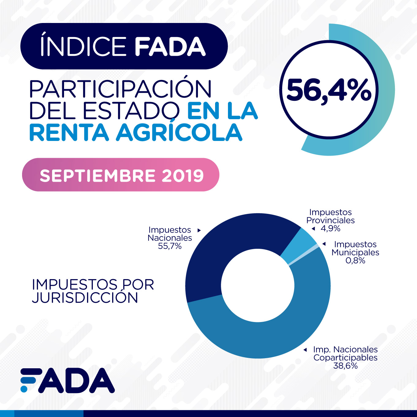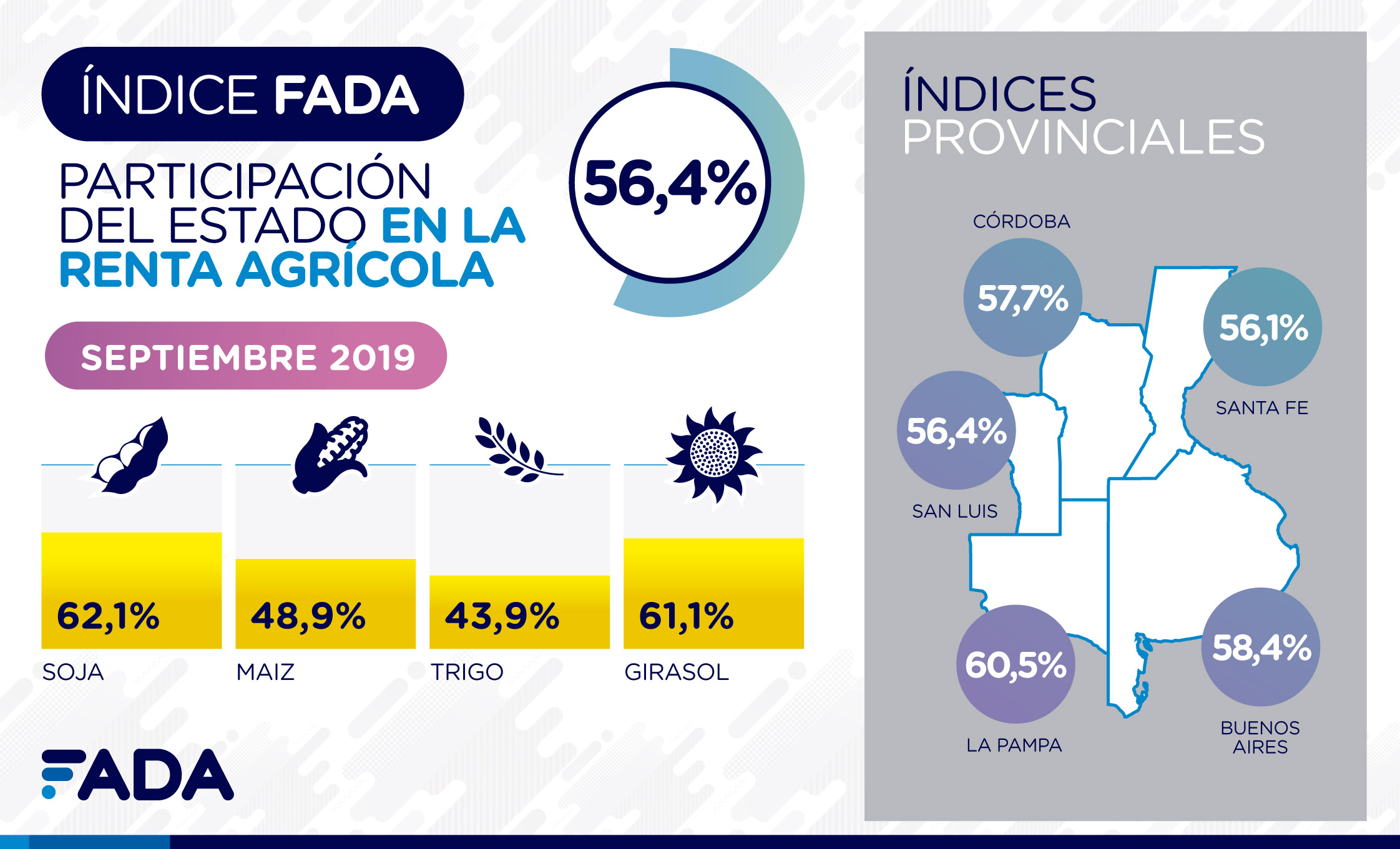 Como cada tres meses, FADA (Fundación Agropecuaria para el Desarrollo de Argentina) presenta su Índice FADA. La medición de septiembre 2019 reveló que el 56,4% de la renta agrícola se distribuye en distintos niveles del Estado. Es decir que, de cada $100 que genera el campo, $56,4 van a los gobiernos: municipal, provincial o nacional. En este estudio, la renta es entendida como el resultado del valor de la producción menos los costos.