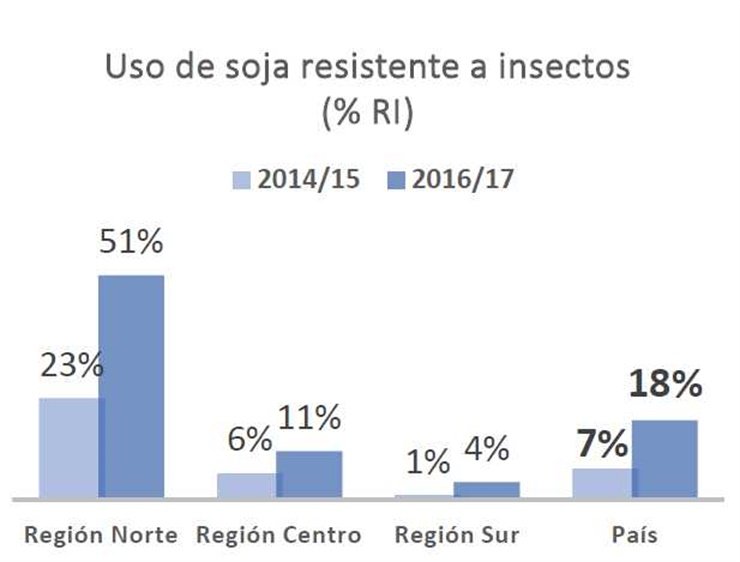 En el caso de soja con evento que otorga resistencia a insectos (RI), no sólo se ha visto una mayor adopción a nivel nacional sino también a escala regional, en relación a la medición 2014/15. Si se divide el territorio agrícola nacional en tres grandes regiones, norte, centro y sur, la región norte (NOA, NEA, Norte de Santa Fe, Corrientes y Misiones) fue la que presentó el mayor crecimiento de uso estos materiales, que alcanzó el 51% en la campaña 2016/17.