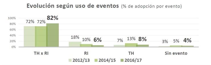 Los híbridos con eventos apilados (TH x RI), es decir, con evento tolerante a herbicidas (TH) y con uno o más eventos resistentes a insectos (RI) alcanzaron el 82% de adopción a nivel país, mientras que materiales simples TH y RI disminuyeron a un 8% y 6% respectivamente. Los materiales sin evento durante los últimos años vienen presentando poca variación en su uso, que fue del 4% durante la campaña 2016/17.