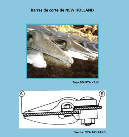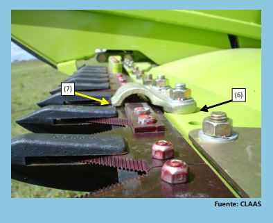 En el modelo de CASE, el ángulo que se ubica por encima de las cuchillas apoya sobre el rodamiento (5) impidiendo el movimiento anteroposterior (hacia adelante y hacia atrás) de la barra de corte, aprovechando toda la capacidad de corte; y la luz entre las cuchillas y los puntones se ajusta a través de las grampas prensa cuchilla (o sapitos).