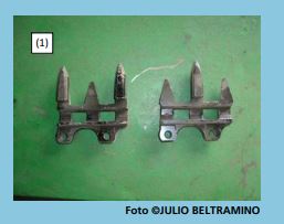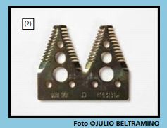 Los puntones son triples y van instalados de tal manera que siempre queden en forma alterna: una punta fija con guarda superior y otra sin ella. Para lograr este armado en la barra de corte, estos puntones vienen en dos modelos de puntones triples complementarios: uno con una punta fija, con guarda superior y dos puntas fijas sin guarda superior, y el otro, con dos puntas fijas, con guarda superior y la otra punta fija sin guarda superior. (1)