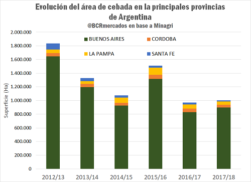 En la región pampeana la participación de la cebada en la campaña fina está supeditada al acuerdo comercial con las malterías, que, a su vez, se ajusta a las necesidades de la industria. Hay que tener en cuenta que en la región central del país la cebada es un cultivo con un riesgo productivo y comercial que en ocasiones los productores no justifican asumir por u$s 10 de prima sobre el precio del trigo. Por lo tanto, se espera que el área de siembra se mantenga estable respecto al ciclo previo.