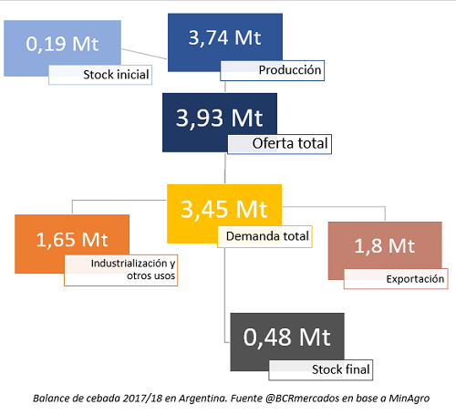 En base a los datos oficiales, la producción de cebada 2017/18 llegó a 3,74 Mt, valor que permite proyectar una recuperación de los stocks finales de 0,19 Mt del ciclo previo a 0,48 Mt para la actual campaña comercial. A su vez, se prevé un menor uso total principalmente por una caída en las exportaciones.