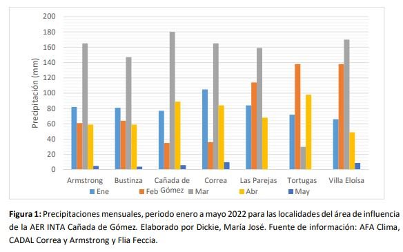Las precipitaciones del mes de mayo presentaron anomalías negativas en las 7 localidades del área de influencia de la AER INTA Cañada de Gómez, acumulándose entre 4 y 10 mm en 5 localidades y en las otras dos, Tortugas y Las Parejas, no se registraron precipitaciones en este mes (Figura 1).
